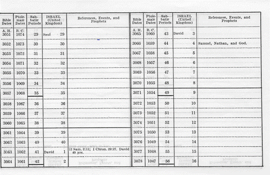 In regard to the forty years of wilderness journeying we have much chronological data referring to events which occurred on certain days of a given year. By adding all of the statements pertaining to this period we get the total of forty years; hence no one who is willing to look at the facts will say that this is an artificial statement. As to David's forty years of reign, we see that there were the six extra months and yet only forty years are attributed to him. Evidently that half year was counted to Saul's reign, according to the principle of computing time as we shall see in discussing the reigns of the latter kings. It is purely arbitrary for one to contend that the figures twenty, forty, and eighty years are artificial, since we have seen that two of them were accurate statements, though given in round numbers, in accordance with the principles of reckoning the Biblical chronology and are mathematically correct. On Page 238 this point I wish to quote from Anstey's epoch-making book The Romance of Bible Chronology. "The number of the Kings of England from William the Conqueror to Queen Victoria is 35. On the theory of averages we should expect the number of years in the reigns of 7 of these to end in a 5 or O. As a matter of fact, 12 or nearly double that number end in one or other of these figures, yet no one supposes that the length of the reigns of the Kings of England is an approximation. "The Book of Judges is a very condensed account of a long period of time. Its space is apportioned at the rate of 5 pages to the Century. A writer on English Architecture would not be guilty of chronological inaccuracy if he dealt in a similarly brief space with the various styles of Gothic Architecture, tabulating them as follows: 11th Century, Norman; 12th Century, Transition; 13th Century, Early English; 14th Century, Decorated; and 15th Century, Perpendicular. As a matter of fact, each of these styles dates from at least a decade or so before the opening year of the Century to which it mainly belongs. But the Chronology of the entire period is not affected thereby. And it must not be supposed that the round numbers used in Scripture are introduced in such a way as to make the Chronology, as a whole, inaccurate or inexact. The reckoning by forties is just as accurate as the reckoning by Centuries. If these numbers are approximations they are self-compensating and self-correcting, and conduct us to a point quite definite and quite exact, for their totals agree with the long numbers measuring long periods by which smaller component numbers are checked. All the above periods of 40 years are checked either by St. Paul's 450 years, in Acts 13: 20, or by the 480 years of I Kings 6: 1, and some of them by both of these long numbers." As Anstey has stated, when the conclusions are drawn from all of the chronological data and we have the total number of years, we can check them by the long periods of blanket statements found in other sections of the Scriptures and find that they tally with mathematical precision; hence it is a gratuitous assumption for one to consider these round numbers as artificial and only approximations. Since the first year of Saul was 3023 A.H. and since he, David, and Solomon each reigned forty years, Solomon's reign ended with the year 3142, and Rehoboam's and Jeroboam's first year was 3143. III. CHRONOLOGICAL CHART OF THE PERIOD Below appears a chart giving the principal events that occurred during the reigns of Saul, David, Solomon. Each page is divided into two main sections. The order of events is continued in the second column from the first. Each line represents a year. In the first column to the left appear the Bible dates. To the right is the column giving the Ptolemaic dates. The next one presents the sabbatic periods. In the next are the names of the sovereigns and the number of years of their reigns. This chart will give us a bird's eye view of the historic situation.